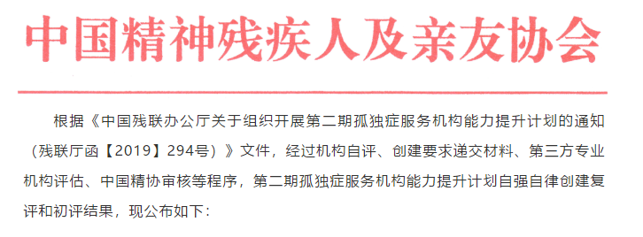 根据《中国残联办公厅关于组织开展第二期孤独症服务机构能力提升计划的通知(残联厅函【2019】294号)》文件,经过机构自评、创建要求递交材料、第三方专业机构评估、中国精协审核等程序。揭阳市星晨自闭症儿童康复中心顺利通过中国残疾人联合会两个阶段的评估认证,成为揭阳市唯一一家孤独症服务机构自强自律创建复评通过机构。